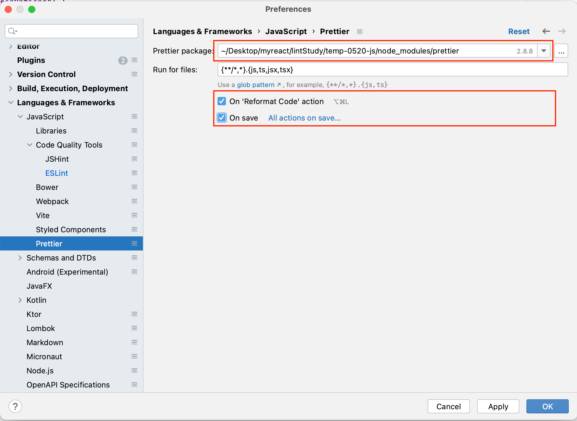 Reformat with Prettier 에 command+s 등록